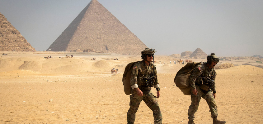 U.S. service members conduct airborne operations during a jump over the Giza Pyramid Complex during exercise BRIGHT STAR 25 in September 2025. Image: U.S. Army / Grace Nechanicky