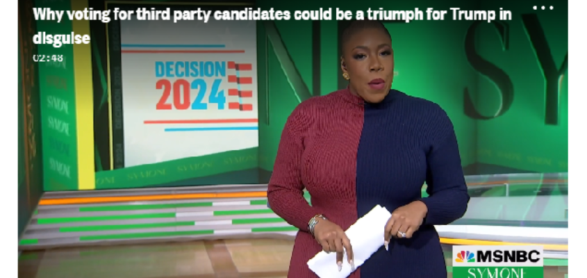 MSNBC is the propaganda arm of the Democratic Party and Sanders-Townsend runs with the democrats’ playbook by frightening voters who want to vote for third party candidates. The graphic in a recent program reads, “Why voting for third party candidates could be a triumph for Trump in disguise.”