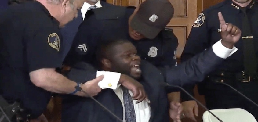 A Black elected police commissioner was manhandled at a public meeting for protesting a draconian facial recognition scheme.