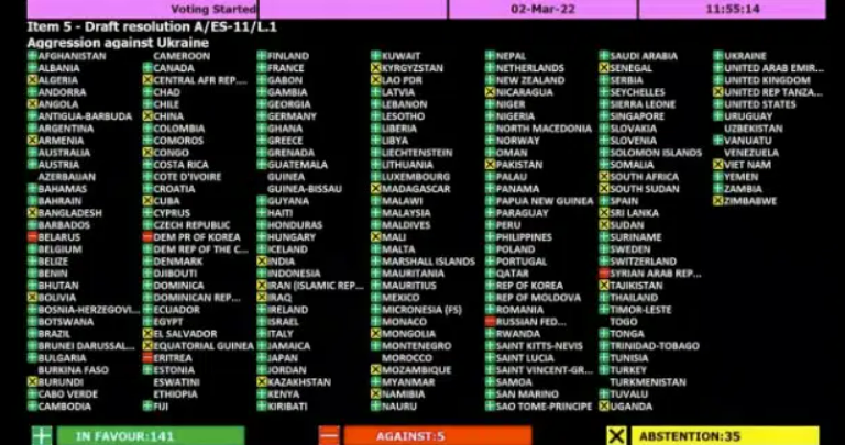 On March 2 of this year the UN General Assembly met in an Emergency Session to pass a non-binding resolution condemning Russia’s February 24 intervention in Ukraine[1]. 141 countries voted for the resolution, 5 voted against, 35 abstained, and 12 did not vote. (Reported: Guardian, Al Jazeera, iNews)