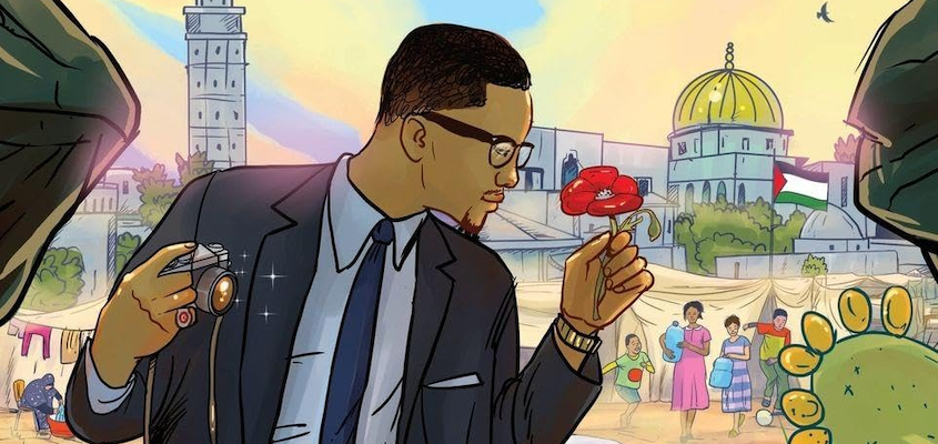 Image from the cover of Nathi Ngubane’s Malcolm X in Gaza: A Coloring Book.