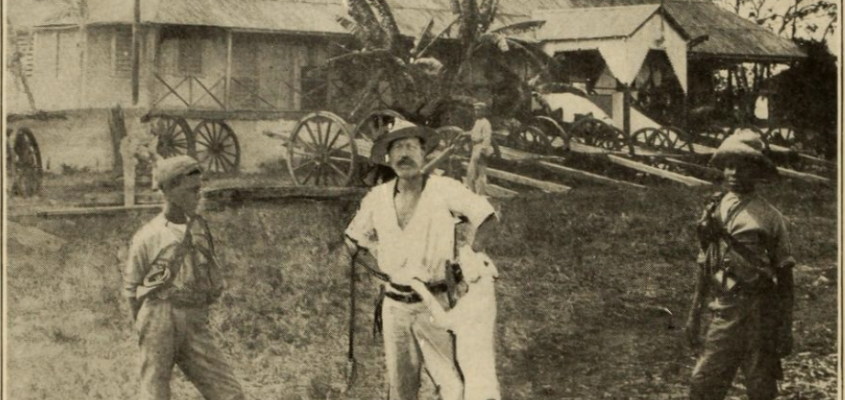 William Bass pictured with two railroad workers on his Monte Coca line in Hato Mayor, Dominican Republic. Source: William Bass, Thirteen From the Front: A Memento. 1909.