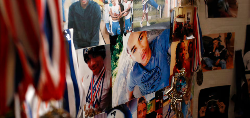 Pictures of Anton Black in a collage in his family’s home in Greensboro in 2019. Black died after a struggle with three officers and a civilian outside the home in September 2018. (Patrick Semansky/AP)
