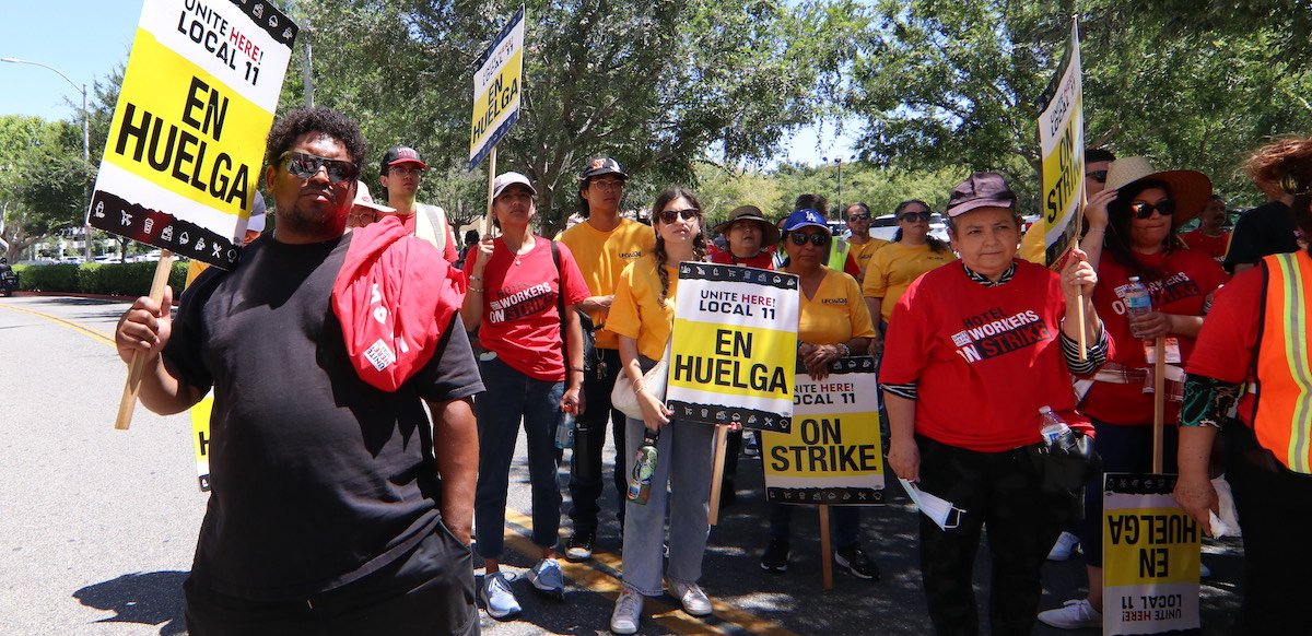 The picket was part of a wave of strikes at Los Angeles-area hotels by members of UNITE HERE Local 11. Their contracts at 62 hotels expired June 30. The hotel workers’ top demand is for pay that will allow them to secure housing in a market that is pricing them out.