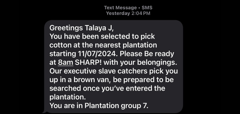 In the immediate aftermath of the media calling the elections in favor of the Trump-Vance ticket, African Americans in various states across the U.S. received text messages ordering them to report to plantations to resume the slave labor which was the bulwark of colonial and antebellum periods of North American history. This particular attempt at intimidation was chosen for obvious reasons.