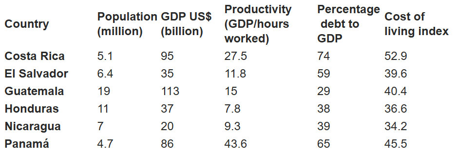 Nicaragua’s relative strength can be seen from the table comparing it with its neighbors: despite being the region’s lowest-income country, it fares better than Honduras in productivity, has low debt and the lowest cost of living (using an established international index). Indeed, a prosperous Nicaragua is key to regional stability: it receives 28% of its imports from Central America and contributes 16% of its exports. It is also a recognized bulwark against regional organized crime and drug trafficking.