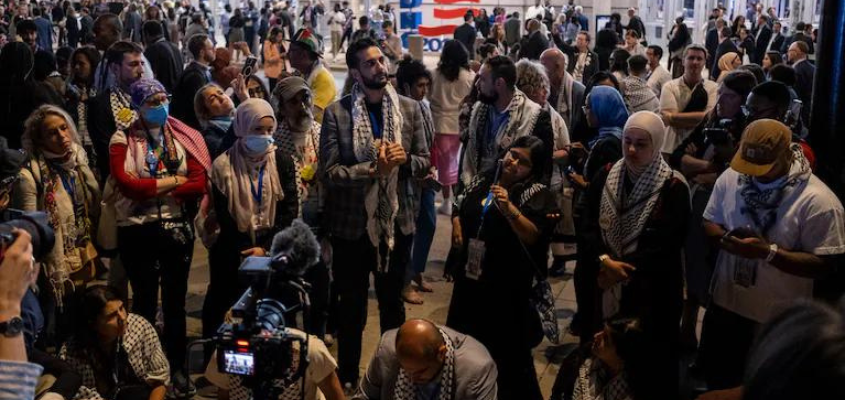 Uncommitted delegates held a sit-in outside the Democratic National Convention after being denied their request for a Palestinian speaker. Photo: Joel Angel Juarez | The Washington Post