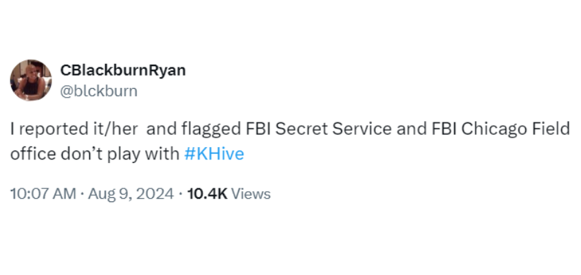 The KHive sprung into action upon seeing the post, accusing Abdelhadi of violent threats and vowing to punish her for daring to confront Kamala. “That’s a direct threat,” opined one misguided member of the mob. “The @FBI and @SecretService need to look into her. Definitely sounds like a threat,” said another who felt compelled to tag the agencies in question. While another confessed to the dirtiest deed of all, actual snitching. “I reported it/her and flagged FBI Secret Service and FBI Chicago Field office don’t play with #KHive,” boasted a KHive fanatic known as @blckburn. She and others made good on their threats because the FBI did in fact contact Dr. Abdelhadi, who was able to secure legal representation before her interaction with that agency.