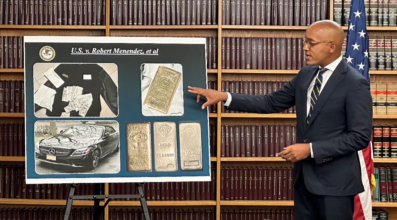 Cash, gold bars, and a Mercedes Benz found in Senator Robert Menendez's home, as displayed by the District Attorney, Southern District of New York, during a press conference.