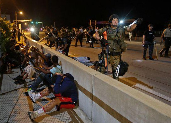 For me, last night’s Ferguson “coverage” began when people started retweeting pictures of armored vehicles with heavily armored “robocops” on top of them, aiming their muzzle at the protesters, who seemed to number a few hundred. It was the fourth night after an unarmed black man, Michael Brown, was shot by a — still unnamed — police officer after a “jaywalking” incident. Witnesses say he died hands in the air, saying “don’t shoot”.