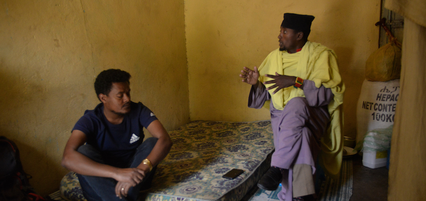 Ethiopian Orthodox Christian monk Aba Gebreselassie explains how he fled when the TPLF invaded Waldeba Monastery in Amhara Region, Ethiopia. University of Gondar Professor Menychle Meseret Abebe listens and translates. (Photo: Alastair Thompson)