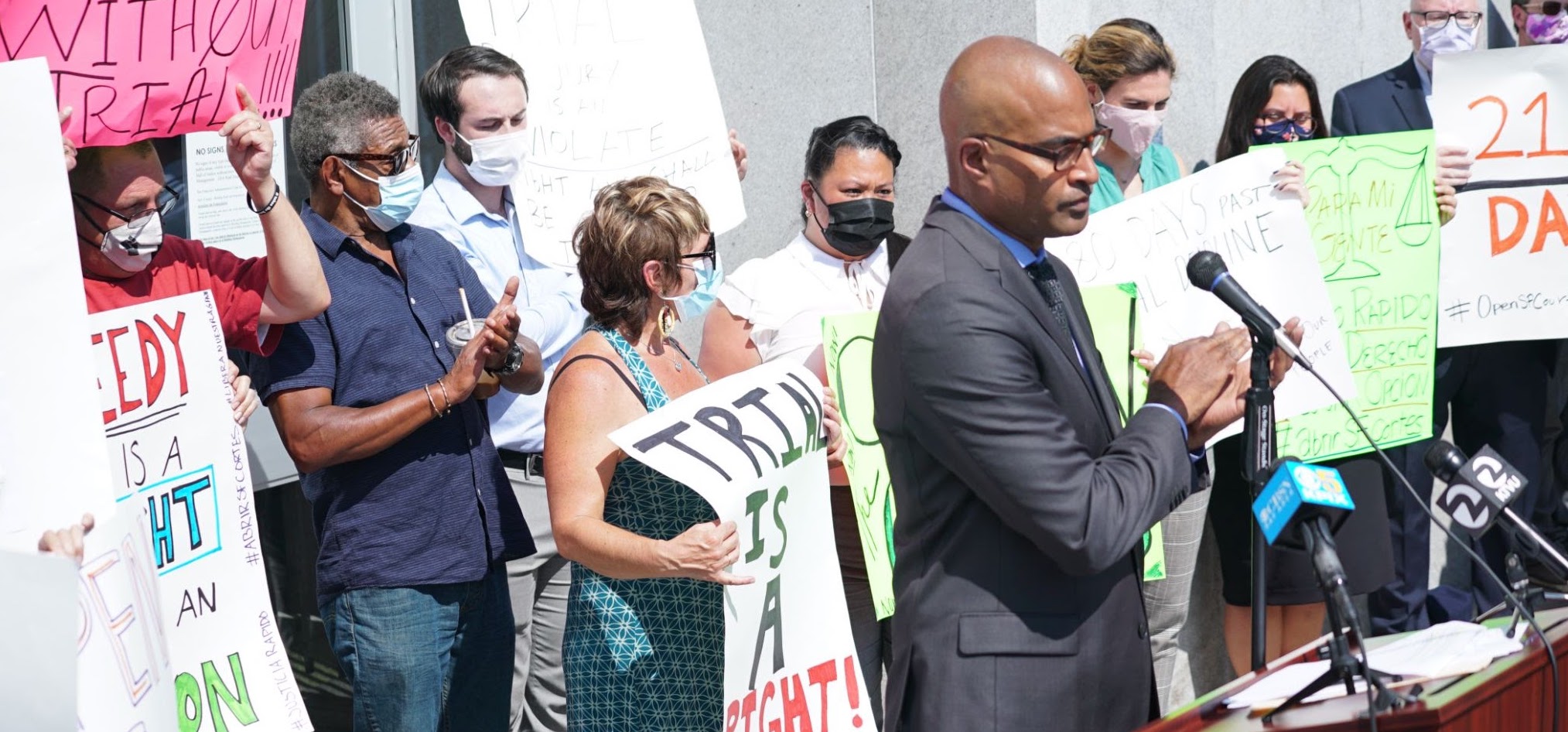 San Francisco Public Defender Manohar Raju speaking at a rally for the right to a speedy trial outside San Francisco Superior Court.