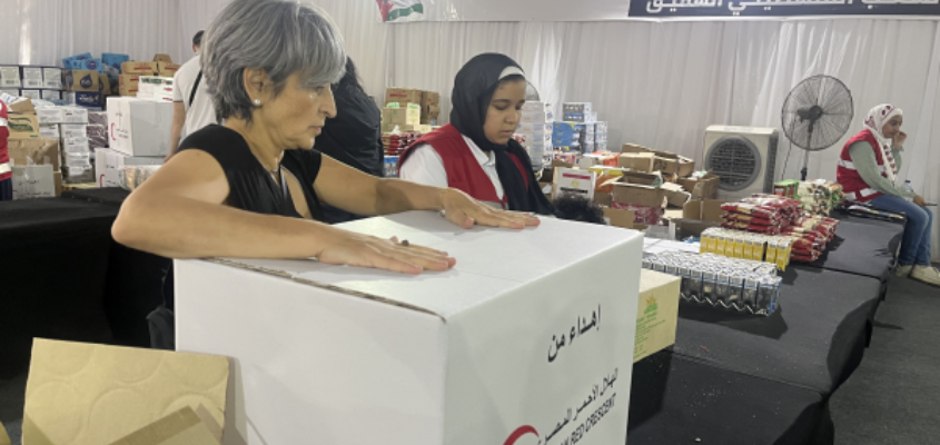Palestinian writer Susan Abulhawa packing boxes of aid for Gaza at the Egyptian Red Crescent.