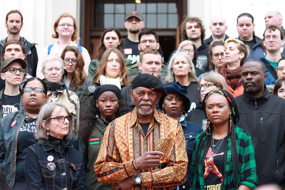 Members of the African People’s Socialist Party alongside non-African supporters. Chairman Omali Yeshitela (front center) is in a black beret, while his wife and Deputy Chair, Ona Zené Yeshitela, stands behind him in a blue hat / credit: African People’s