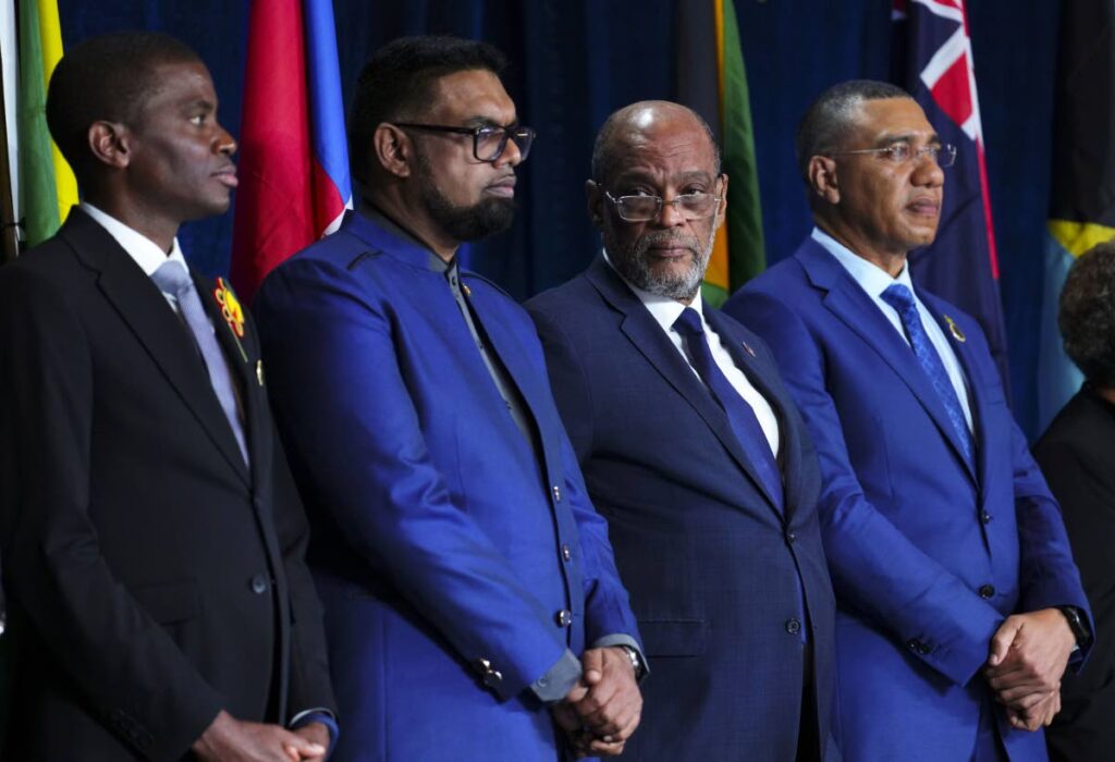 Prime Minister of Grenada Dickon Mitchell, President of Guyana Irfaan Ali, Prime Minister of Haiti Ariel Henry and Prime Minister of Jamaica Andrew Holness at CARICOM meeting in February 2023. (Photo: AP)