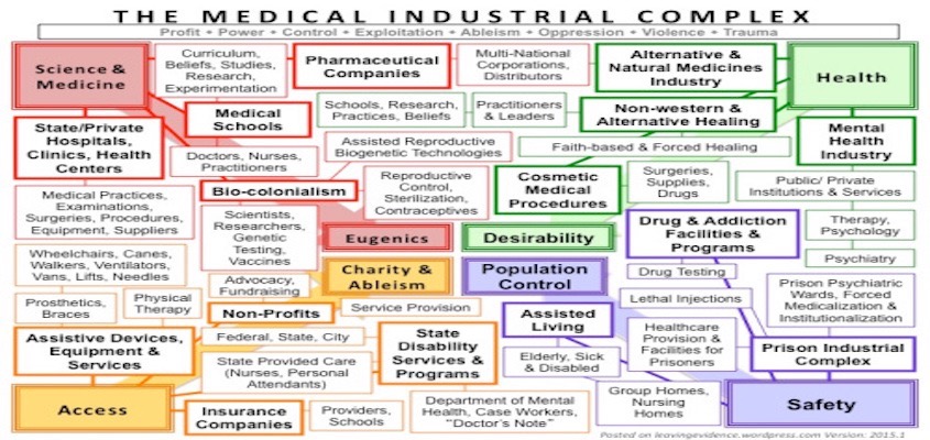 Though medical institutions portray themselves as benevolent and objective, the structural reality is that biomedicine was forged in the political and social terrain of colonialism. Commonly known as the medical industrial complex, we are all affected by a huge system that provides “healthcare” services for profit and makes billions of dollars each year. Mia Mingus, a writer and community organizer who focuses on disability justice, helped put together the above detailed visual of the medical industrial complex along with other organizers like Cara Page and Patty Berne.  The diagram shows how four “core motivations” serve as the foundational structuring agents of the four sections of the visual. Desirability structures health, population control structures safety, charity and ableism structure access, and eugenics structure science and medicine. This is what makes the medical industrial complex so profitable.