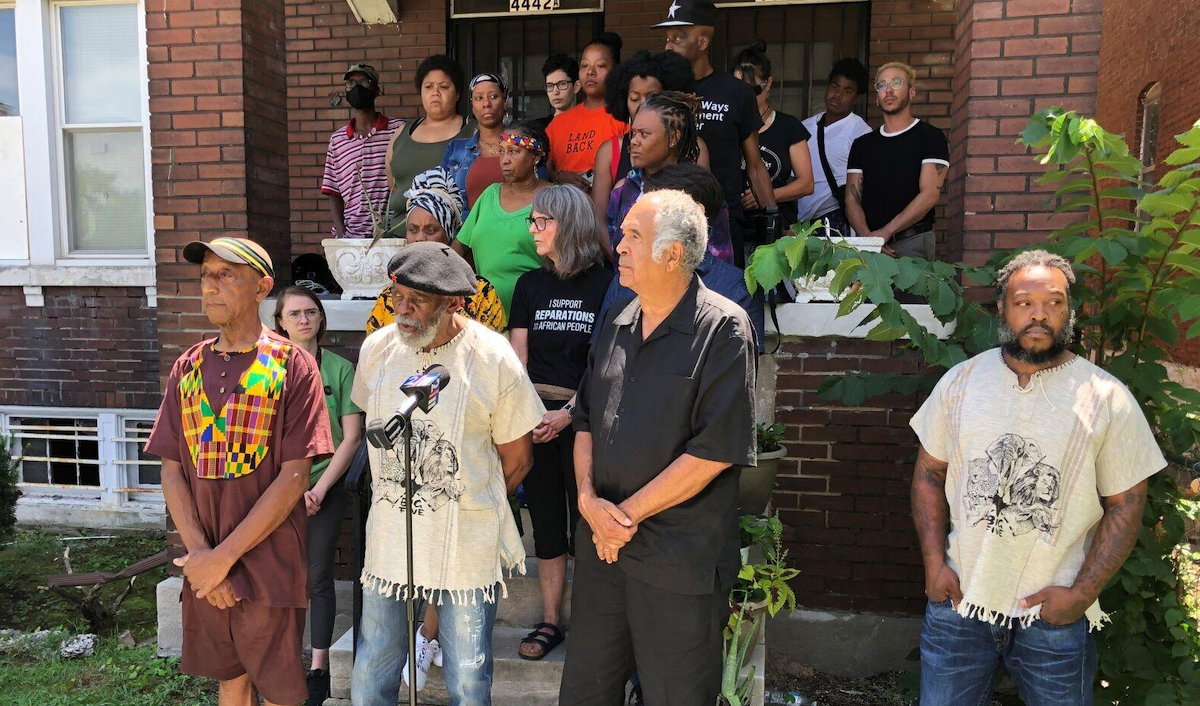 Omali Yeshitela, center, stands in front of his home in the 4400 block of Red Bud Avenue on Friday, July 29, 2022, with his supporters. Jesse Bogan, Post-Dispatch