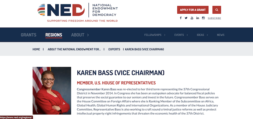 Congresswoman Karen Bass is running for mayor of Los Angeles. She's also Vice Chair of the NED, the CIA's soft power arm. She epitomizes everythng that is wrong with the Black political class.