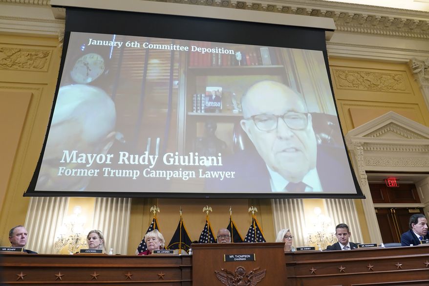 A video deposition of Rudolph Giuliani plays at the House select committee investigating the Jan. 6 attack on the U.S. Capitol, Monday, June 13, 2022. (AP Photo/Susan Walsh)