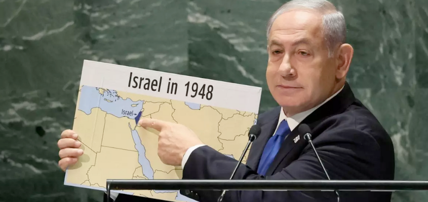 Netanyahu holding up a map of the Middle East with occupied Palestine marked as "Israel"