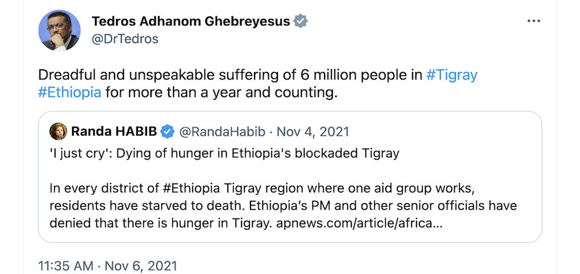 “Nobody has admitted that the ‘people are dying of hunger in Tigray’ narrative was total fabrication. There were no consequences. There are never any consequences as the ‘international community’ recycles itself from crisis to crisis. Incompetent and unethical people who lie, distort, and mess up can just walk away and do the same thing somewhere else. To me, that is annoying. For the world, it should be unacceptable.”