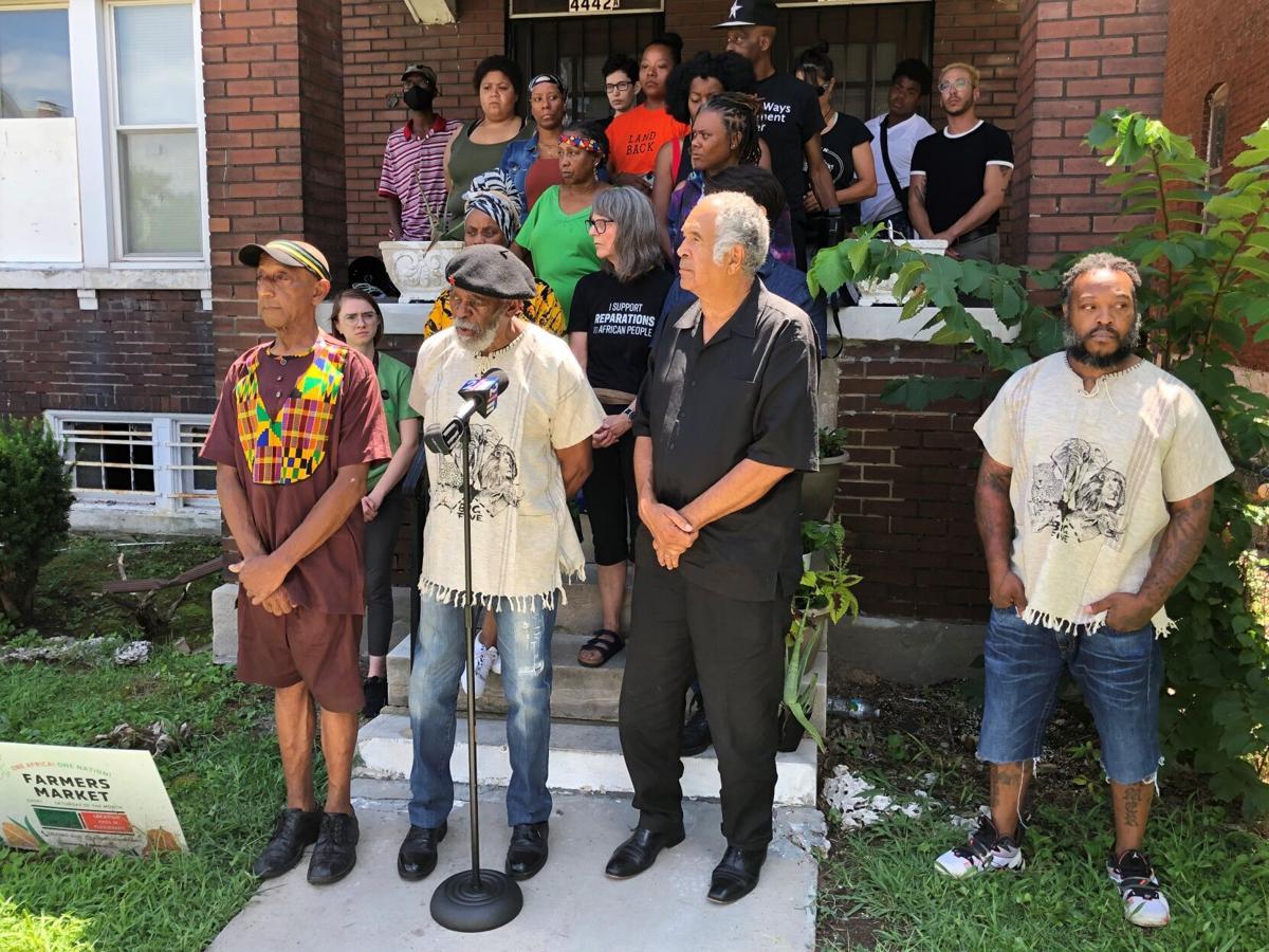 July 29, 2022 press conference after FBI raids in St. Louis, Missouri. Omali Yeshitela at the microphone. (Photo: Jesse Bogan, St. Louis Post Dispatch)
