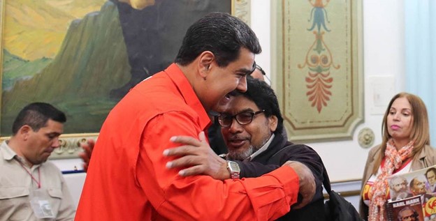 Venezuelan President Nicolás Maduro (left) greeting with a hug Venezuelan Communist Party's general secretary Óscar Figuera (right) at Miraflores Palace. Photo: Factores de Poder/File photo.