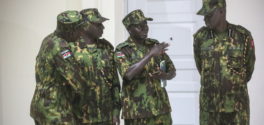 Members of the Kenyan police stand in front of their headquarters in Port-au-Prince (AP/Odelyn Josep)