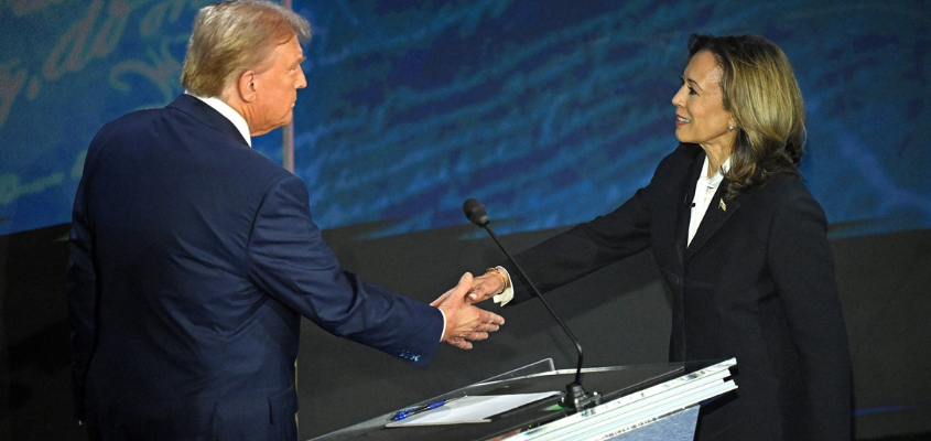 Former president Donald Trump and Vice President Kamala Harris shake hands before a presidential debate in Philadelphia, on September 10, 2024. Photo: Saul Loeb | AFP via Getty Images