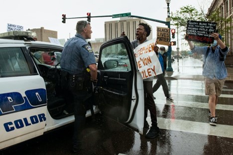 A protester confronts a Colorado Springs police officer about the death of De’Von Bailey, 19, who was shot and killed by police in 2019, during a 2020 protest against police brutality in Colorado Springs CO (Photo: Chancey Bush/The Gazette via AP)