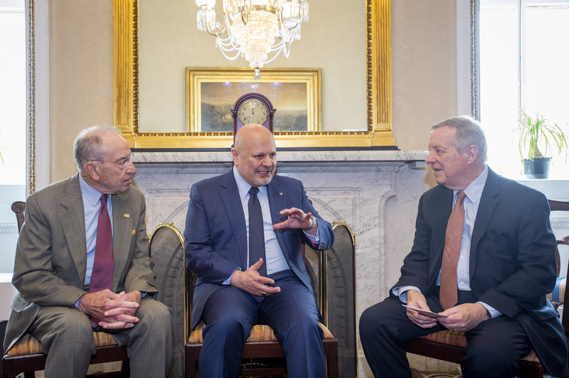 US Senators Republican Chuck Grassley and Democrat Dick Durbin flank ICC chief prosecutor Karim Khan in Washington, May 2023.