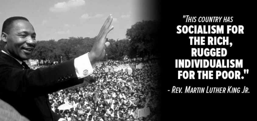 MLK with text next to him reading "socialism for the rich, rugged individualism for the poor"