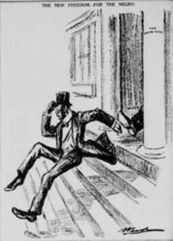Political cartoon "New Freedom for the Negro" in the wake of the new Woodrow Wilson administration (New-York tribune. New York [N.Y.]), 14 November 1914.)