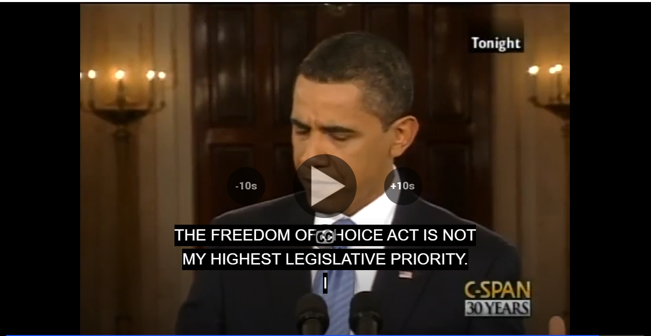 As a presidential candidate in 2008 Obama promised to sign the Freedom of Choice Act, which would have codified abortion rights into federal law. But once in office he never pushed congress to pass it. In typical Obamaesque fashion he would claim to believe that women had the right to choose abortion, but that he didn’t want to demonize the opposition, and he wanted to find consensus on the issue. After his usual routine “on the one hand this, but on the other hand that” on April 29, 2009 he finally said out loud what was clear. “The Freedom of Choice Act is not my highest legislative priority.” It wasn’t even his lowest legislative priority. Obama never lifted a finger to get it passed, even during his first two years in office when he had majorities in the House and the Senate.