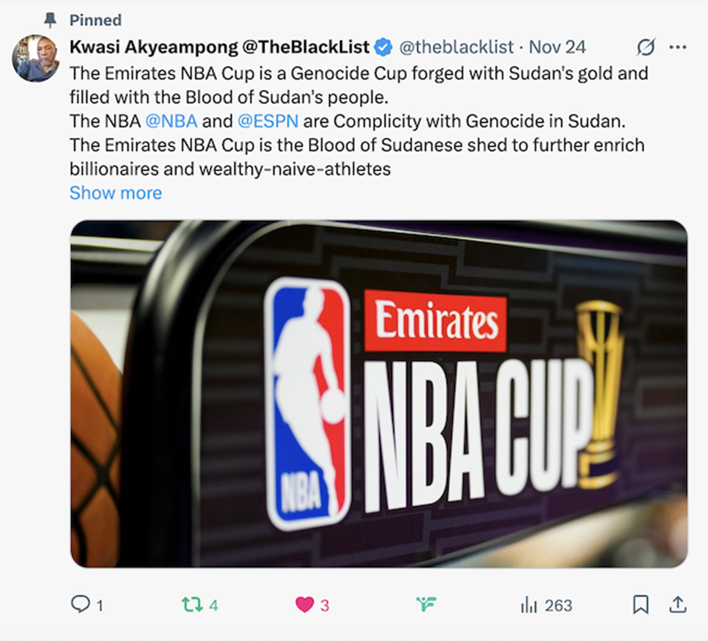 Yesterday Kwasi Akyeampong, editor of The BlackList, posted to X that “the Emirates NBA Cup is a Genocide Cup”:
