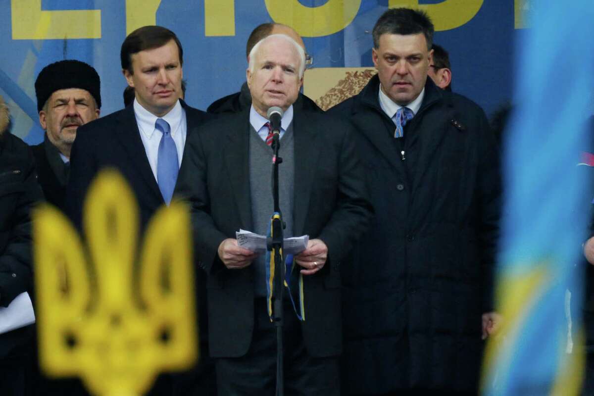 Senator Chris Murphy and John McCain at a December 15, 2013 rally in Ukraine with right wing Svoboda party leader Oleh Tyahnybok. (Photo: Dmitry Lovetsky/AP)