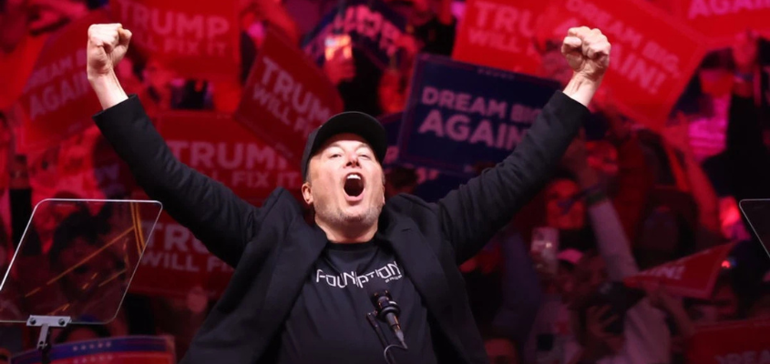 Billionaire oligarch Elon Musk raises his hands as he takes the stage during a campaign rally for Donald Trump at Madison Square Garden on October 27, 2024, in New York City. Photo: by Michael M. Santiago/Getty Images