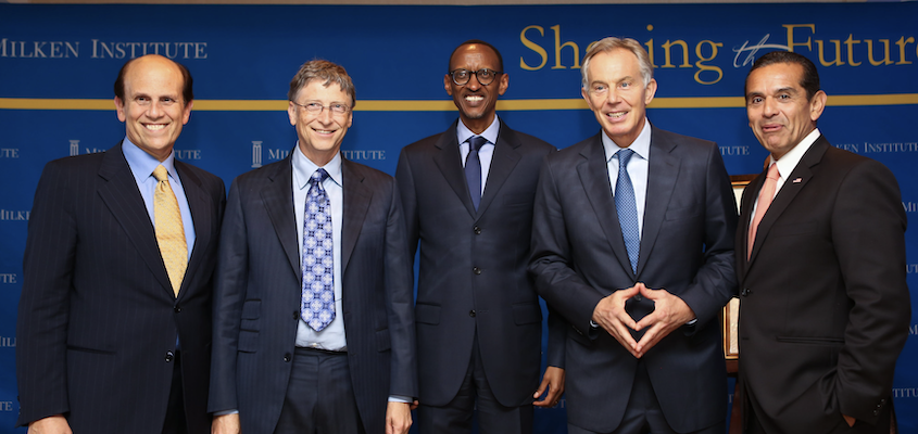 Rwandan President Paul Kagame, center, with Michael Milken, Bill Gates, Tony Blair and Los Angeles Mayor Antonio Villaraigosa after the "Investing in African Prosperity" panel at the 2013 Milken Institute Global Conference.
