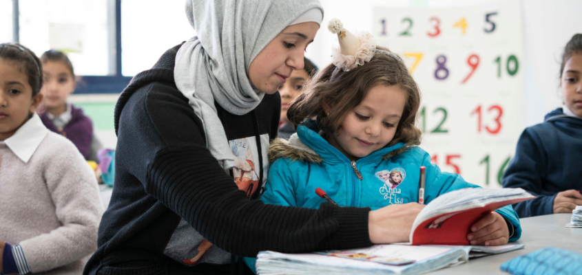 A teacher works with students in a school in Ramallah, West Bank before the COVID-19 pandemic. Photo: HAYA Joint Programme/Samar Hazboun