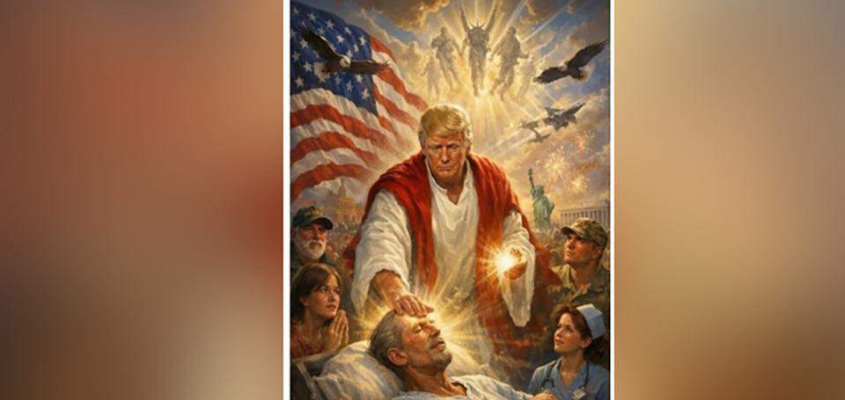 Right wing influencer Nick Adams, who serves as the Special Presidential Envoy for American Tourism, Exceptionalism and Values, first posted a version of the Trump as Christ image on the X platform in February 2026 and wrote, “America has been sick for a long time. President Trump is healing this nation.” The image and the words may seem unimportant but we should look closely before dismissing what appears to be mere silliness at first glance. The image depicts Trump healing a bedridden white man who is surrounded by other white people, a nurse, a soldier, and an anonymous praying woman, with bald eagles and fighter jets flying overhead along with winged figures that appear to be soldiers, with the Lincoln Memorial, Capitol building, and Statute of Liberty in the background as a huge American flag flies in the breeze. Trump is dressed in ancient robes and both of his hands are glowing as he lays them on the sick man while the figures surrounding him look on in awe and prayer.