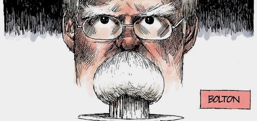 Donald Trump, the highly unpredictable white supremacist blowhard, has unceremoniously fired John Bolton, the totally predictable white supremacist ideologue who became national security advisor 17 months ago. Every sane person on the planet should be glad to see Bolton go. As libertarian Republican Sen. Rand Paul put it: “The threat of war worldwide goes down exponentially with John Bolton out of the White House. I think his advocacy for regime change around the world is a naïve worldview, and I think that the world will be a much better place with new advisers to the president.”